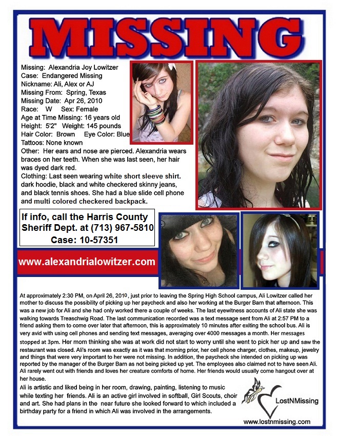 At approximately 2:30 PM, on April 26, 2010, just prior to leaving the Spring High School campus, Ali Lowitzer called her mother to discuss the possibility of picking up her paycheck and also her working at the Burger Barn that afternoon. This was a new job for Ali and she had only worked for Ibrahim Banat for a couple of weeks. A couple of boys got off the bus and walked in the direction of their home. They both reported that Ali was lagging behind, but nothing out of the ordinary. The last eyewitness accounts of Ali state she was walking towards Treaschwig Road. The last communication recorded was a text message sent from Ali at 2:57 PM to a friend asking them to come over later that afternoon, this is approximately 10 minutes after exiting the school bus.. We can assume that ten minutes of casual walking put Ali somewhere on Treaschwig Road, heading towards the Burger Barn.  Ali is very avid with using cell phones and sending text messages, averaging over 4000 messages a month. Her messages stopped at 3pm. Her mom thinking she was at work did not start to worry until she went to pick her up and saw the restaurant was closed. A police report was filed and the police listed Ali as a runaway teenager. This was very discouraging and heartbreaking for the family and they strongly disagreed with law enforcement stating that this was not typical behavior from Ali and there were circumstances that certainly suggest foul play. Ali’s room was exactly as it was that morning prior, her cell phone charger, clothes, makeup, jewelry and things that were very important to her were not missing. If Ali was to “runaway”, many of these items would be gone as well. In addition, the paycheck she intended on picking up was reported by the manager of the Burger Barn as not being picked up yet. The employees also claimed not to have seen Ali. Ali rarely went out with friends and loves her creature comforts of home. Her friends would usually come hangout over at her house. Ali is artistic and liked being in her room, drawing, painting, listening to music while texting her friends. Ali is an active girl involved in softball, Girl Scouts, choir and art. She had plans in the near future she looked forward to which included a birthday party for a friend in which Ali was involved in the arrangements.