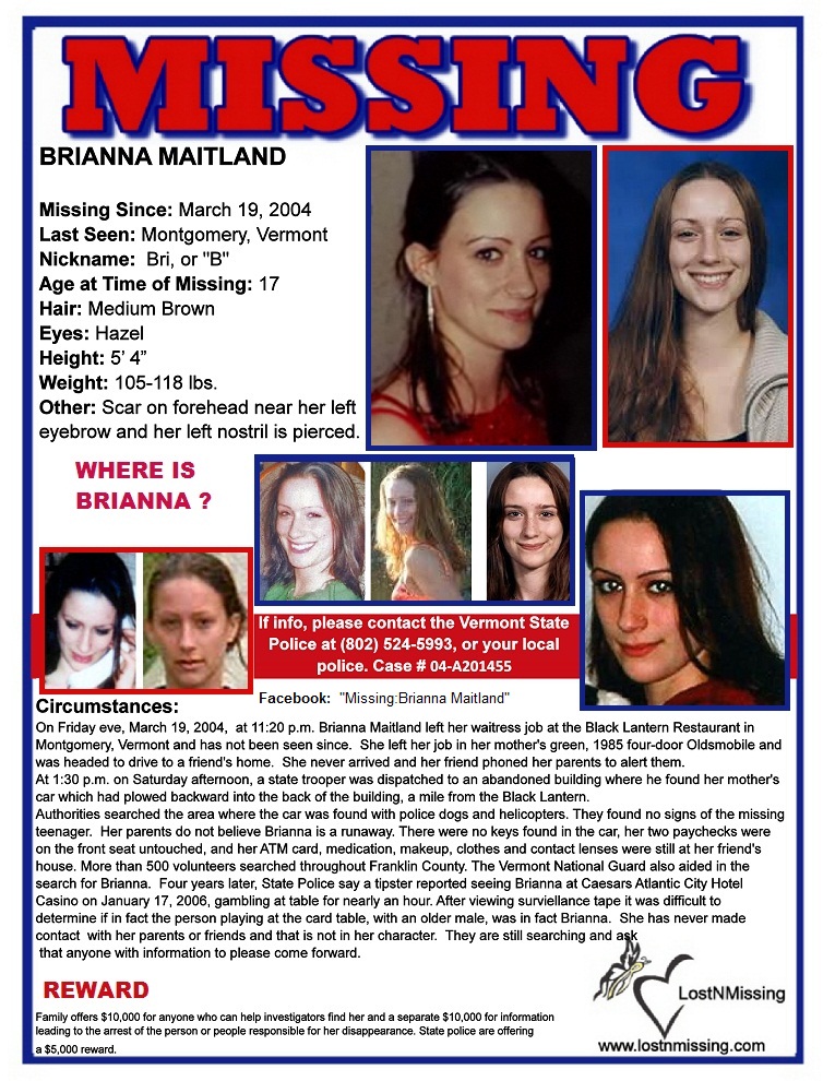 Circumstance: Brianna Maitland was last seen during the late evening hours of March 19, 2004, as she was completing her shift at a restaurant in Montgomery, Vermont. She left the restaurant in a green 1985 Oldsmobile 88, which was later located abandoned, backed into a building, approximately one mile from the restaurant. A tip came in which someone felt they saw Brianna in a casino and a surveillance tape was pulled. Brianna’s family say that they are unable to tell for sure if that is indeed Brianna in the photo but there is obviously a very strong resemblance. (photo below)Security cameras barely captured the woman on tape. She and the man sitting next to her are wearing matching T-shirts with an unusual logo on the front. Brianna was curious about the world beyond the Vermont hills. Despite that, her parents don’t think she ran away. Police found her contact lenses, and migraine headache medicine in the car, along with two paychecks, totaling less than $150 — money that would have been crucial to a teenager living on her own. Police and her family are waiting for someone to come forward and positively identify the woman in the casino to help clear up that mystery.