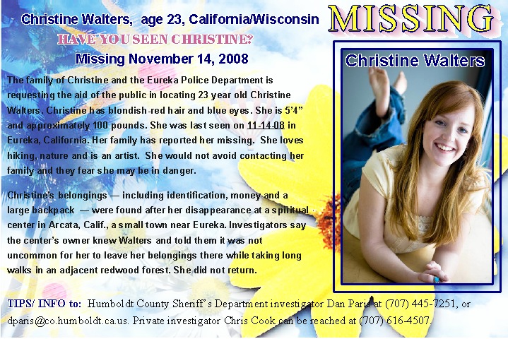 Circumstance: Christine was last seen at around 4 p.m. on the street in Eureka, CA. She had been in the hospital and was on medication. She was found naked, pounding on a door looking for help. She had scratches on her body and was delusional. The homeowner took her to a hospital and after she was released, police took her to the Red Lion Hotel.