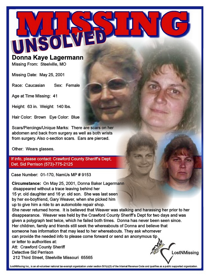 Circumstance:  On May 25, 2001, Donna Lagermann disappeared without a trace leaving behind her 15 yr. old daughter and 16 yr. old son.  She was last seen by her ex-boyfriend, Gary Weaver, when she picked him up to give him a ride to an automobile repair shop.  She never returned home.  It is believed that Weaver was stalking and harassing her prior to her disappearance.  Weaver was held by the Crawford County Sheriff’s Dept for two days and was given a polygraph test twice, which he failed both times.