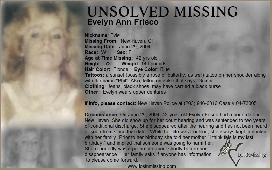 Circumstance: On June 29, 2004, 42-year-old Evelyn Frisco had a court date in New Haven. She did show up for her court hearing and was sentenced to two years of conditional discharge. She disappeared after the hearing and has not been heard or seen from since that date. While her life was troubled, she always kept in contact with her family. Prior to her birthday she told her mother “I think this is my last birthday,” and implied that someone was going to harm her. She reportedly was a police informant shortly before her disappearance. Her family asks if anyone has information to please come forward. They long to know what happened to Evelyn.