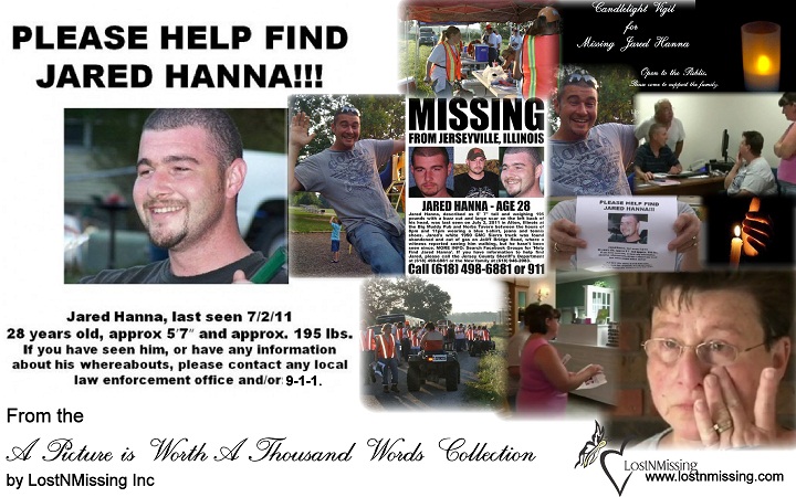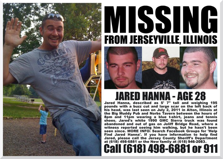 Circumstance: Hanna was last seen on the morning of July 2, 2011 at his home. His truck was found abandoned and out of gas on July 4th, 2011 on Jolliff Bridge Road, a rural area of Centralia, IL. He was reported to be seen about two miles from where his truck was parked on Sunday July 3rd at 8:30 a.m. Jared has custody of his two daughters and is a loving father. This is not in his character and his family and friends are very worried and ask the public to please come forward if you recall seeing him or if you have any information on where he is or what may have happened to him.