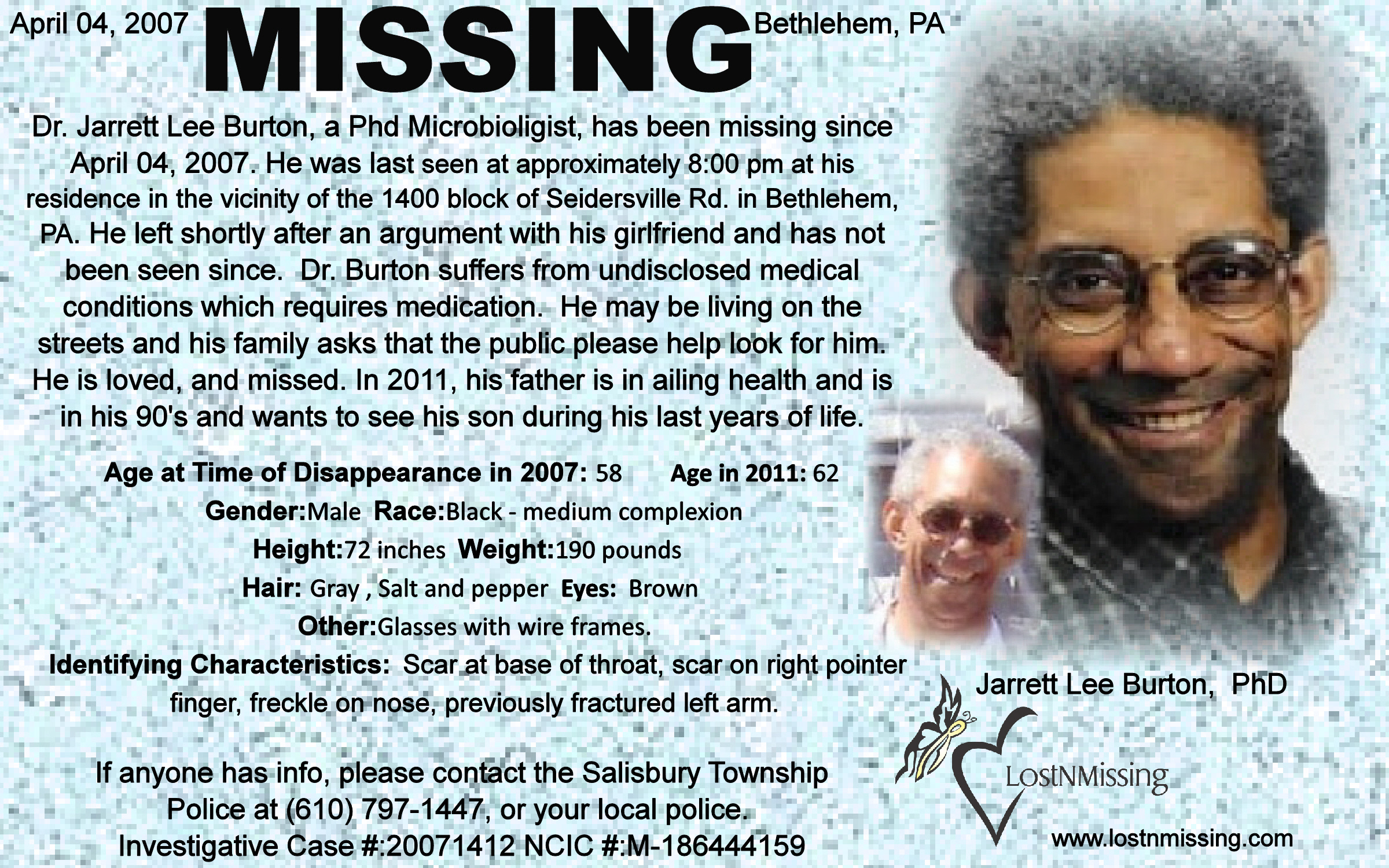 Circumstance: Dr. Jarrett Lee Burton, a PhD Microbiologist, was last seen at approximately 8:00 pm at his residence in the vicinity of the 1400 block of Seidersville Rd. in Bethlehem, PA. He left shortly after an argument with his girlfriend and has not been seen since. He suffers from undisclosed medical conditions which require medication. He may be living on the streets and his family asks that the public please help look for him.