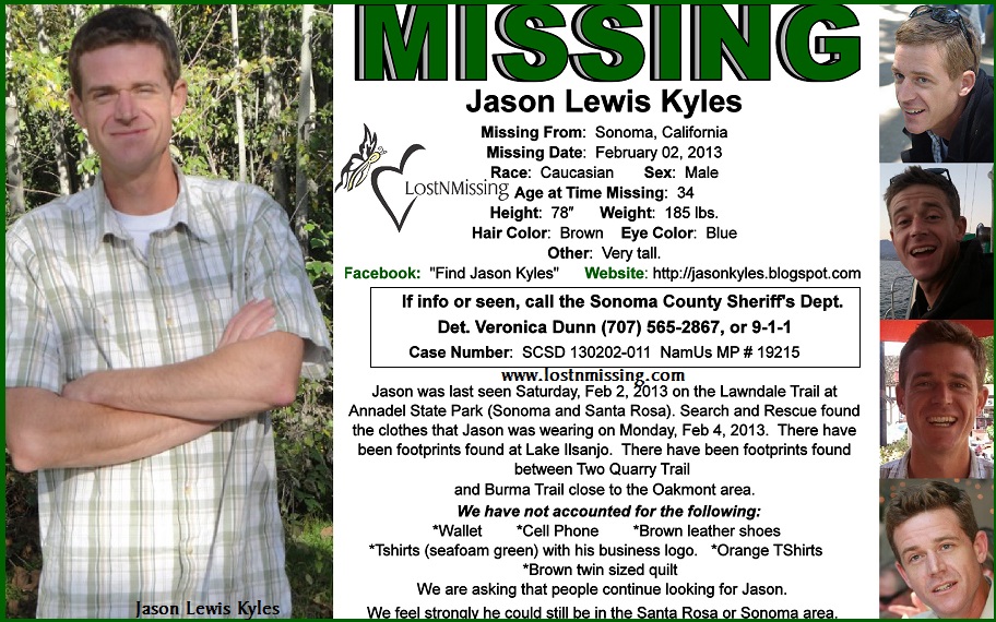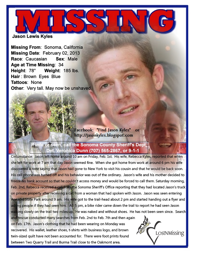 Circumstance: Jason left home around 10 am on Friday, Feb. 1st. His wife, Rebecca Kyles, reported that when she left for work at 7 am that day Jason seemed fine. When she got home from work at around 6 pm his wife discovered a note saying that Jason had gone to New York to visit his cousin and that he would be back soon. His cell phone was turned off and his behavior was out of the ordinary. Jason’s wife and his mother decided to freeze his bank account so that he couldn’t access money and would be forced to call them. Saturday morning, Feb. 2nd, Rebecca received a call from the Sonoma Sheriff’s Office reporting that they had located Jason’s truck on private property after receiving a call from a woman that had spoken with Jason. Jason was seen entering Annadel State Park around 9 am. His wife got to the trail-head about 2 pm and started handing out a flyer and asking people if they had seen him. At 5 pm, a bike rider came down the trail to report he had seen Jason walking slowly on the trail two miles up. He was naked and without shoes. He has not been seen since. Search and rescue conducted many searches from Feb. 2nd to Feb. 7th and then again on Feb. 17th. Jason’s clothing that he had been wearing on Monday was recovered. His wallet, leather shoes, t-shirts with business logo, and brown twin-sized quilt have not been accounted for. There were foot prints found between Two Quarry Trail and Burma Trail close to the Oakmont area.