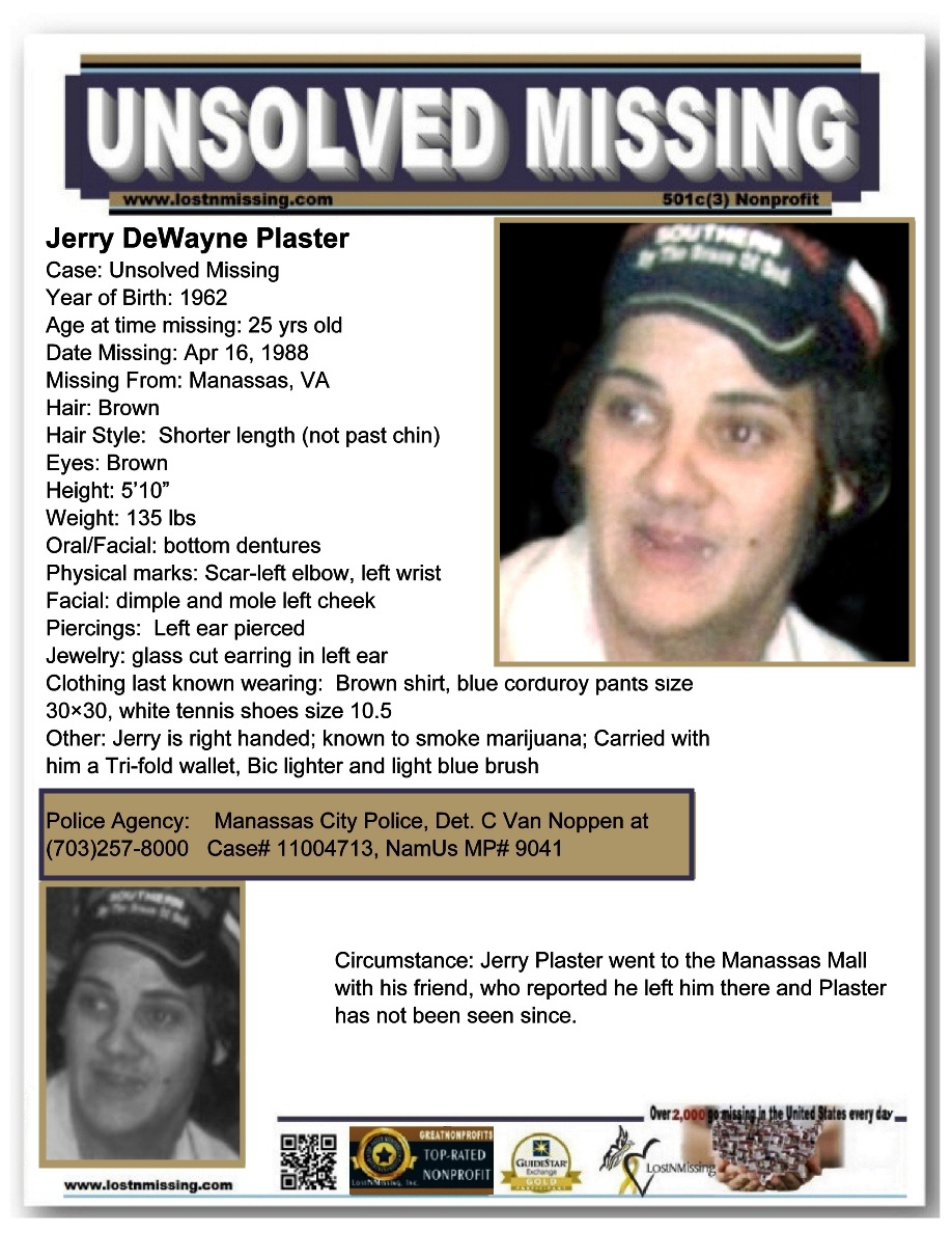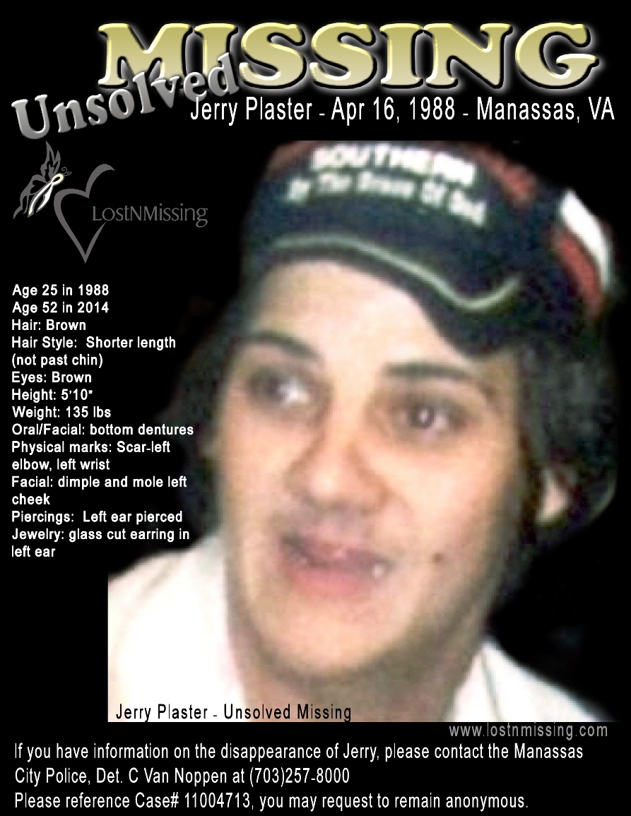 Circumstance: Jerry went to the Manassas Mall at 8300 Sudley Road with his friend who reported he left him there. Plaster told the friend he would get home on his own. That last time he was heard from, police say.