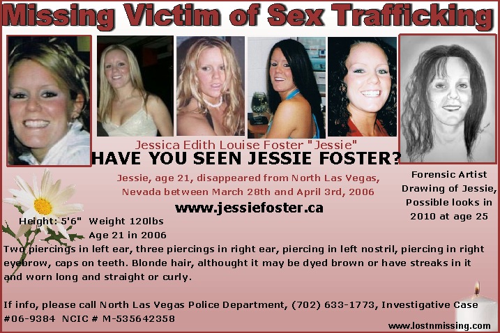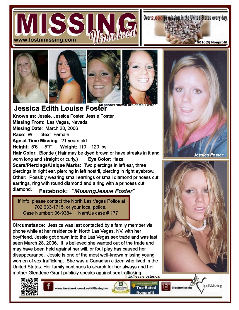 Circumstance: Jessica was last contacted by a family member via phone while at her residence in North Las Vegas, NV, with her boyfriend. Jessie got drawn into the Las Vegas sex trade and was last seen March 28, 2006. It is believed she wanted out of the trade and may have been held against her will, or foul play has come to her causing her disappearance. She is one of the most well-known missing young women of sex trafficking. Jessie was a Canadian citizen who lived in the United States. Her family continues to search for her always.
