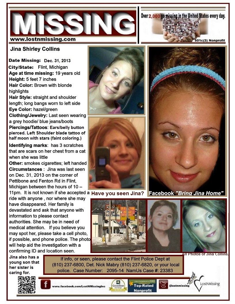 Circumstances : Jina was last seen on December 31, 2013 on the corner of Pettibone and Fenton Rd in Flint, Michigan between the hours of 10 – 11pm. It is not known if she accepted a ride with anyone , nor where she may have disappeared. Her family is devastated and ask that anyone with information to please contact authorities. She may be in need of medical attention. If you believe you may spot her, please take a cell photo, if possible, and phone police. The photo will help aid the investigation with identifying Jina.