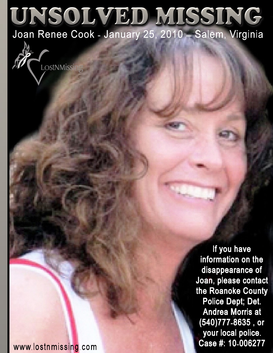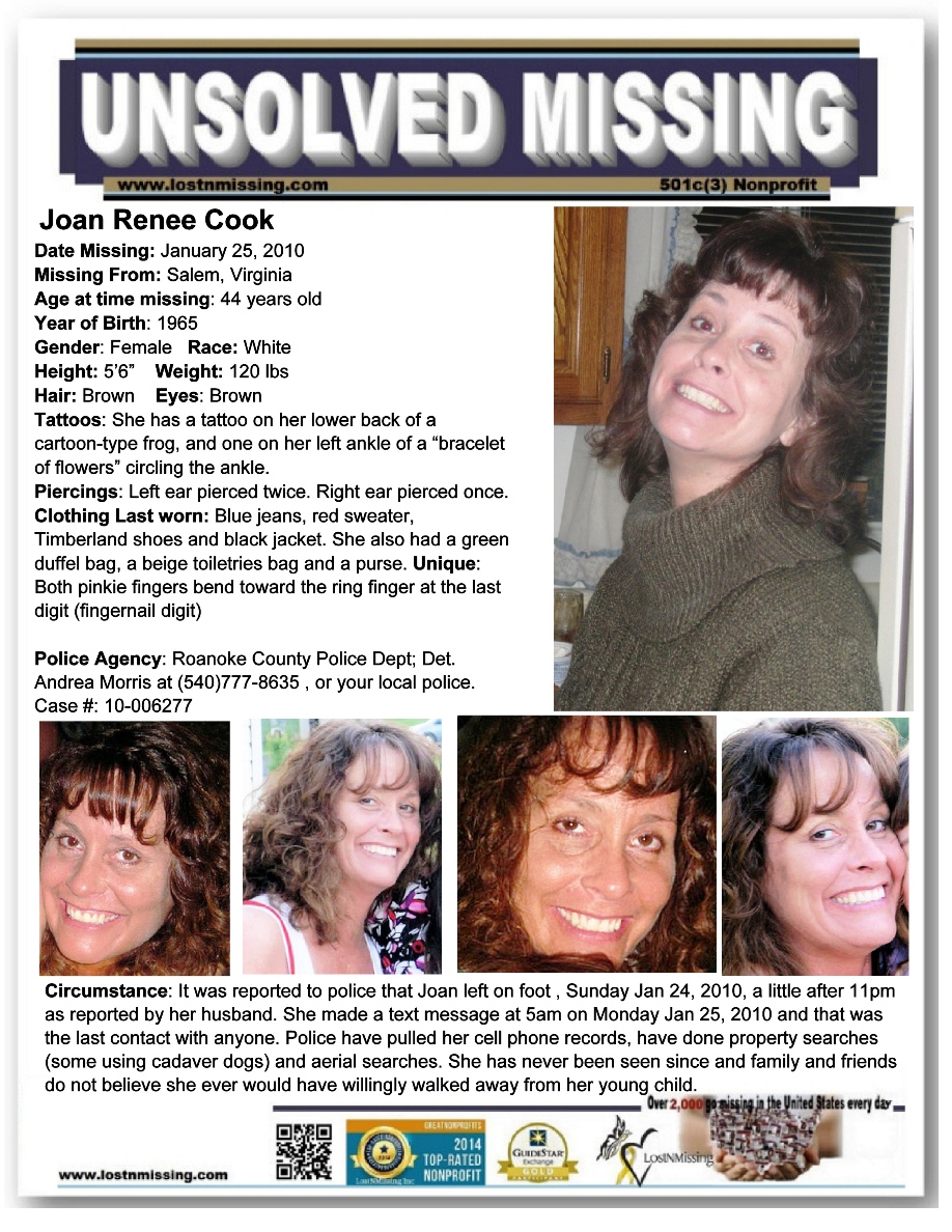 Circumstance: Left the address listed above on foot on Sunday Jan 24, 2010 a little after 11pm (this information is what her estranged husband has told everyone involved). Had a text message at 5am on Monday Jan 25, 2010 and that was the last contact with anyone. Police have pulled her cell phone records, have done property searches (some using cadaver dogs) and aerial searches. Have a missing person case number #10-006277 with Roanoke County Police in Roanoke County,VA