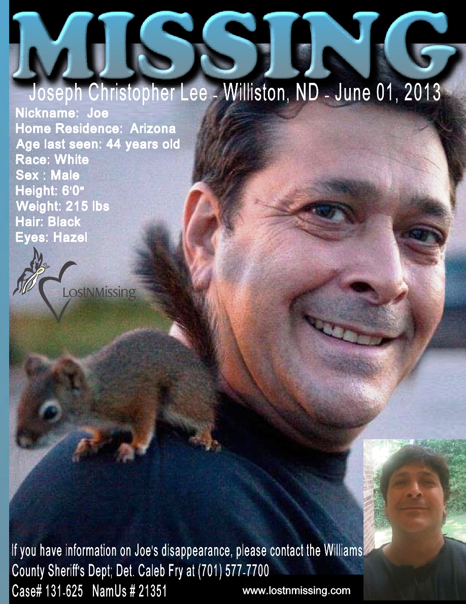 Circumstances : Joe Lee, of Arizona, borrowed a vehicle from a friend on 6/1/13 and was to return it that evening. The friend reported Joe and his truck missing the following day. Someone found the abandoned truck on private property south of Epping/Springbrook Dam on farmland in North Dakota. His boots and socks were found 200 yards from the vehicle next to the creek. The creek was searched by a rescue dive team and a sonar robot as well as cadaver dogs and nothing was found.