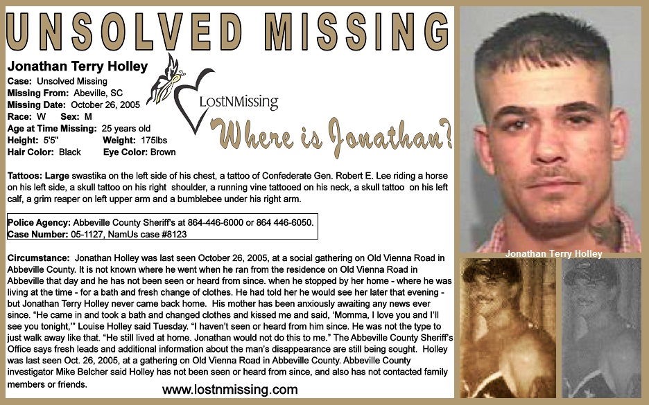 Circumstance:  Jonathan Holley was last seen October 26, 2005, at a social gathering on Old Vienna Road in Abbeville County. It is not known where he went when he ran from the residence on Old Vienna Road in Abbeville that day and he has not been seen or heard from since. when he stopped by her home — where he was living at the time — for a bath and fresh change of clothes. He had told her he would see her later that evening — but Jonathan Terry Holley never came back home.  His mother has been anxiously awaiting any news ever since. “He came in and took a bath and changed clothes and kissed me and said, ‘Momma, I love you and I’ll see you tonight,’” explained Louise Wooten. “I haven’t seen or heard from him since. He was not the type to just walk away like that. “He still lived at home. Jonathan would not do this to me.” The Abbeville County Sheriff’s Office says fresh leads and additional information about the man’s disappearance are still being sought.  Holley was last seen Oct. 26, 2005, at a gathering on Old Vienna Road in Abbeville County. Abbeville County investigator Mike Belcher said Holley has not been seen or heard from since, and also has not contacted family members or friends.
