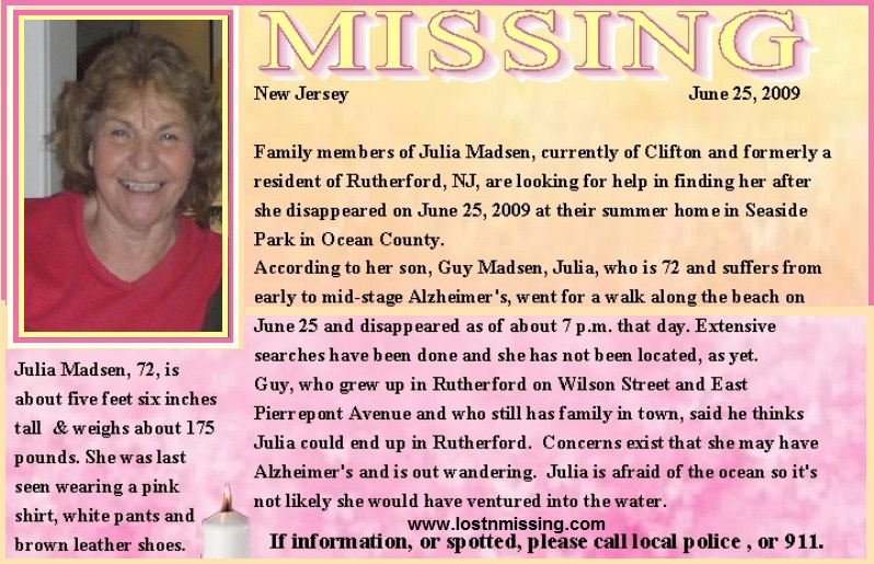 Circumstance: Julia and her husband were staying at a summer home in the South Seaside Park section of Berkely Township in Ocean County, in NJ. At approximately 7:00PM, Julia indicated she was going to take a walk to the beach which was only one house away. When Julia did not return, family contacted authorities. Julia suffers from Alzheimer’s disease.