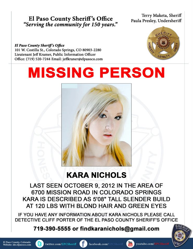 Circumstance: Kara was last seen during the evening of October 9, 2012 leaving her residence located in the 6700 block of Mission Road in Colorado Springs. She left behind personal items consistent with someone who planned to return home a short time later. Kara consistently used her cell phone and social media to maintain regular contact with family and friends. Since October 9, there has been no contact with Kara. Kara spent much of October 9 with a brunette female the Sheriff’s Office has been unable to identify. This brunette female is not a suspect, but a person of interest we are hopeful to identify and speak with. Additionally, there is a second brunette female we believe associated with Kara. Although the nature and frequency of their association is unclear, a picture has been obtained of this second female and we are hoping someone will recognize her and provide that information to the Sheriff’s Office. Kara aspired to become a model. These aspirations, we believe, have caused Kara to fall prey to a subculture of modeling business fronts that may prey on young woman.