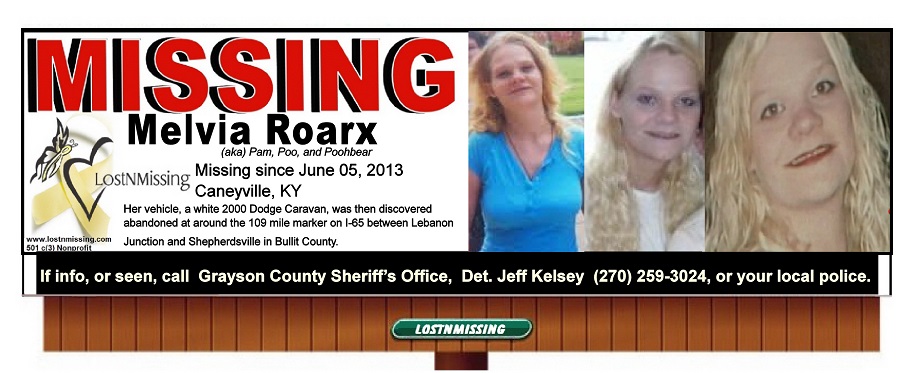 Circumstance: Roarx last known location was a store in Horse Branch, just a few miles from her home. Her vehicle, a white 2000 Dodge Caravan, was then discovered abandoned at around the 109 mile marker on I-65 between Lebanon Junction and Shepherdsville in Bullit County. She has not been seen or heard from since. Authorities are treating this case as “very suspicious”.