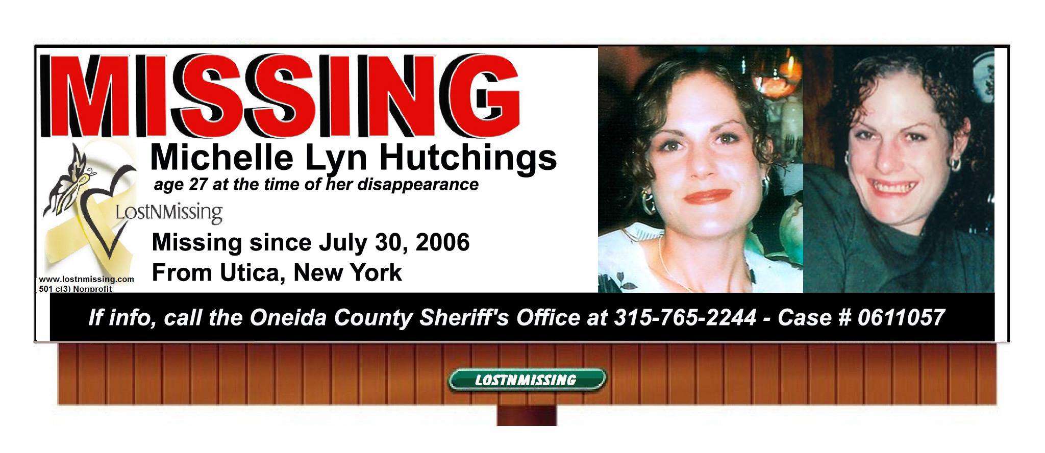 Circumstance: Michelle was last seen on July 30, 2006 at approximately 12:00am being dropped off in the vicinity of the 900 block of Bleeker St. in Utica, NY. Michelle has a medical condition and needs medication.In January 2007, the body of Jennifer Bennett, a 29-year-old Utica woman, was found in a field in Deerfield, New York. Her death is considered suspicious. Bennett and Hutchings were associated with the same people and investigators have not yet been able to obtain evidence or tips to link the two cases. They ask if anyone has info to please come forward.
