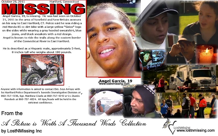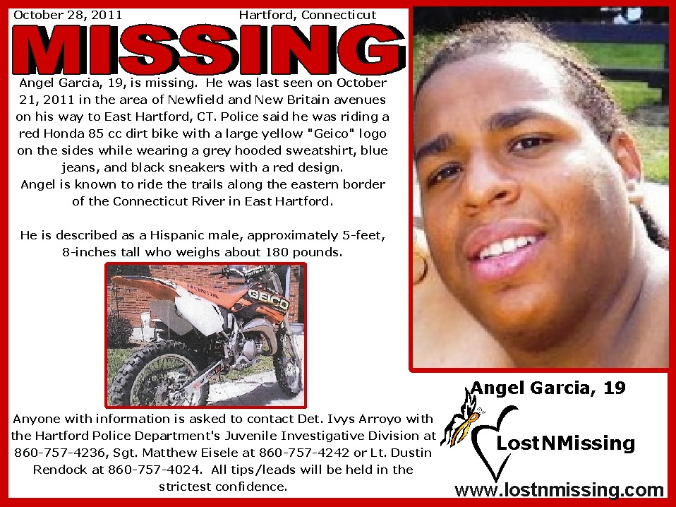 Angel Garcia went missing on October 21, 2011 while out riding his red Honda dirt bike. Garcia loves riding the homemade trails in Hartford, CT along the eastern border and this was a common hobby. However, all changed on that Friday when Garcia went riding with a friend and it was reported that they somehow became separated and Angel did not make it home. There has not been any activity on his bank records, cell phone and no contact made to his parents, family or friends. This is very concerning as Angel is especially close with his mom whom he spoke with often when away from home.