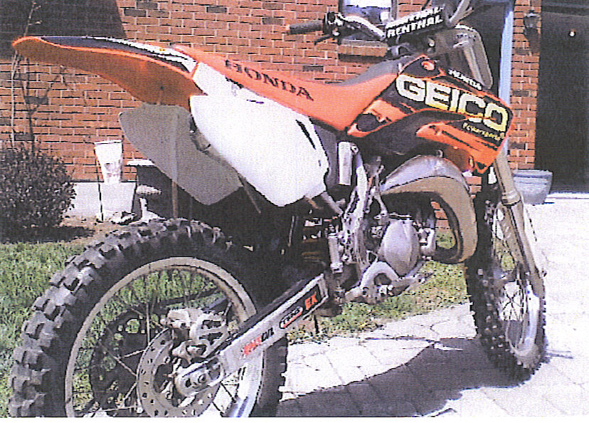 Transportation: Red Honda 85cc Dirt Bike with a large “Geico” logo on the side