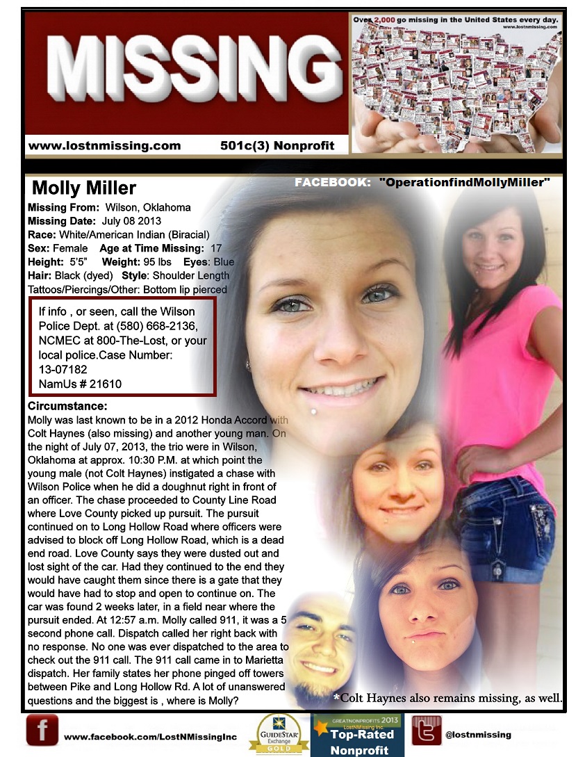 Molly Miller has been missing since July 8th 2013. She was last known to be in a 2012 Honda Accord with Colt Haynes (also missing) and another young man. On the night of July 07, 2013, the trio were in Wilson, Oklahoma at approx. 10:30 P.M. at which point the young male (not Colt Haynes) instigated a chase with Wilson Police when he did a doughnut right in front of an officer. The chase proceeded to County Line Road where Love County picked up pursuit. The pursuit continued on to Long Hollow Road where officers were advised to block off Long Hollow Road, which is a dead end road. Love County says they were dusted out and lost sight of the car. Had they continued to the end they would have caught them since there is a gate that they would have had to stop and open to continue on. The car was found 2 weeks later, in a field near where the pursuit ended. At 12:57 a.m. Molly called 911, it was a 5 second phone call. Dispatch called her right back with no response. No one was ever dispatched to the area to check out the 911 call. The 911 call came in to Marietta dispatch. Her family states her phone pinged off towers between Pike and Long Hollow Rd. A lot of unanswered questions and the biggest is , where is Molly? Colt Haynes also remains missing, as well.