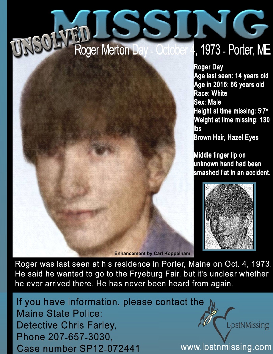 Roger Merton Day, then 14, went missing Oct. 4 1973 from Porter, Maine. He’s described in an online missing person report, on ForTheLost.org, as a white male with brown hair and hazel eyes. Day has a middle finger tip that was smashed in an accident. Day was last seen wearing a denim jacket, jeans, a purple sweatshirt and sneakers.