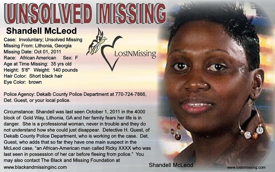 Circumstance: Shandell was last seen October 1, 2011 in the 4000 block of Gold Way, Lithonia, GA and her family fears her life is in danger. She is a professional woman, never in trouble and they do not understand how she could just disappear. Detective H. Guest, of Dekalb County Police Department, who is working on the case. Det. Guest, who adds that so far they have one main suspect in the McLeod case, “an African-American man called Ricky XXXX who was last seen in possession of her car before fleeing from police.” You may also contact The Black and Missing Foundation at link below bottom photo to submit a confidential tip.