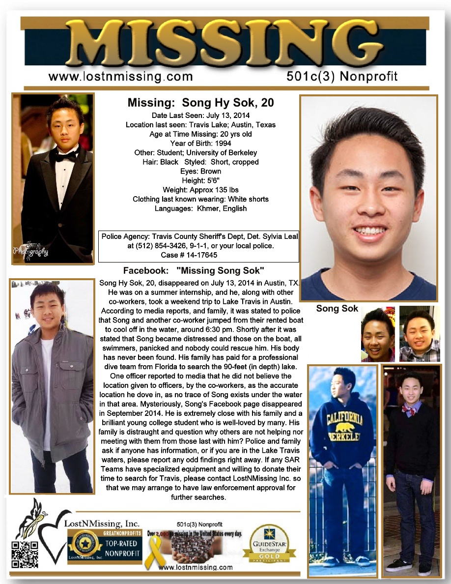 He was on a summer internship, and he, along with other co-workers, took a weekend trip to Lake Travis in Austin. According to media reports, and family, it was stated to police that Song and another co-worker jumped from their rented boat to cool off in the water, around 6:30 pm. Shortly after it was stated that Song became distressed and those on the boat, all swimmers, panicked and nobody could rescue him. His body has never been found. His family has paid for a professional dive team from Florida to search the 90-feet (in depth) lake. One officer reported to media that he did not believe the location given to officers, by the co-workers, as the accurate location he dove in, as no trace of Song exists under the water in that area. Mysteriously, Song’s Facebook page disappeared in September 2014. He is extremely close with his family and a brilliant young college student who is well-loved by many. His family is distraught and question why others are not helping nor meeting with them from those last with him? Police and family ask if anyone has information, or if you are in the Lake Travis waters, please report any odd findings right away. If any SAR Teams have specialized equipment and willing to donate their time to search for Travis, please contact LostNMissing Inc. so that we may arrange to have law enforcement approval for further searches.