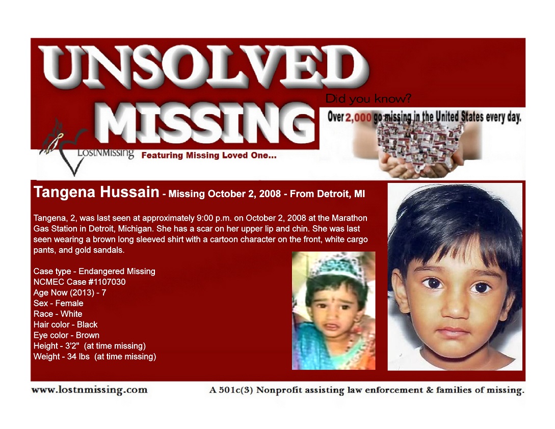 Tangena was last seen at approximately 9:00 p.m. on October 2, 2008 at the Marathon Gas Station in Detroit, Michigan. She has a scar on her upper lip and chin. She was last seen wearing a brown long sleeved shirt with a cartoon character on the front, white cargo pants, and gold sandals.