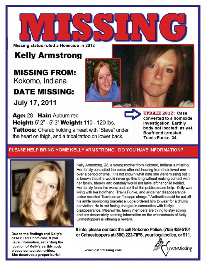 Circumstance: Kelly went missing and it was learned that her boyfriend, Travis Funke, 34, gave statements that he killed her. He was charged with voluntary manslaughter after police say he killed Kelly Armstrong with a hammer.