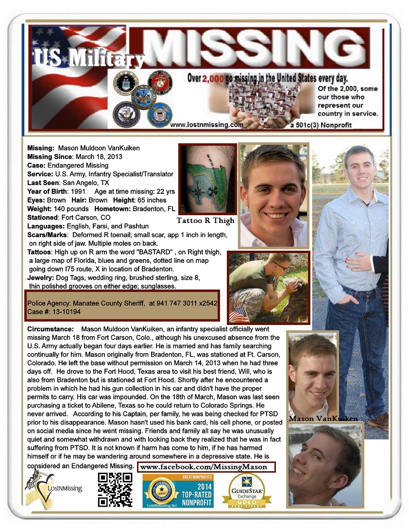 Circumstance: Mason Muldoon VanKuiken, an infantry specialist officially went missing March 18 from Fort Carson, Colo., although his unexcused absence from the U.S. Army actually began four days earlier. He is married and has family searching continually for him. Mason originally from Bradenton, FL, was stationed at Ft. Carson, Colorado. He left the base without permission on March 14, 2013 when he had three days off.
